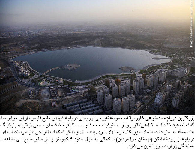 Chitgar Lake is an artificial and recreational lake located in the north of Chitgar Park, in northwestern. Also known as the Lake of the Martyrs of the Persian Gulf, this complex has a total area of around 250 hectares; 130 hectares across the lake and 120 hectares on its coastal zone and resorts.About 80% of the lake’s water comes from Kan Creek, and the remaining 20% comes from central areas and surface runoffs of the district.