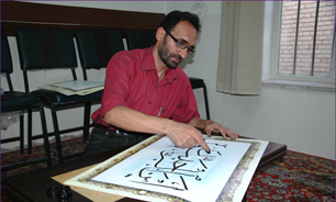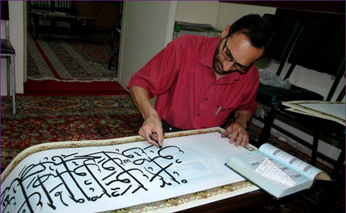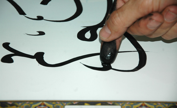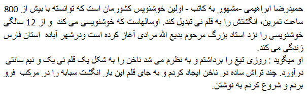 Hamid Reza Ebrahimi is a famous scriber, who had practice at first calligrapher to have over 800 hours of calligraphy could use his fingers as pen.He is a calligraphy from many years ago . He said that he decided one day to picked razor nails into a reed pen took one and a half inches . A few simple preparations and nail in place by the time I have left index finger dipped and I started to calligraphy.