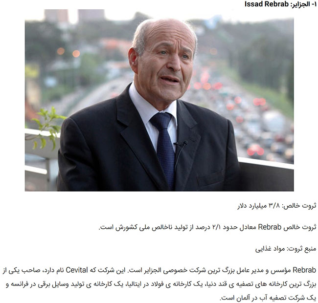 Rebrab is the founder and CEO of Algeria’s largest privately-held company, Cevital, which owns one of the world’s largest sugar refineries. The company also owns an Italian steel mill, a French appliances maker, and a German water purification company.
