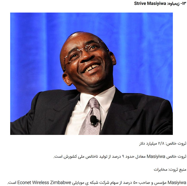 He also owns more than half of Liquid Telecom, a private company that supplies fiber optic and satellite services to telecom companies throughout Africa.