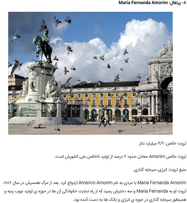 Amorim was married to Americo Amorim. After he died in 2017, she and her three daughters inherited his fortune, which was made in the family’s cork business, Corticeira Amorim, as well as international investments in energy and banks.