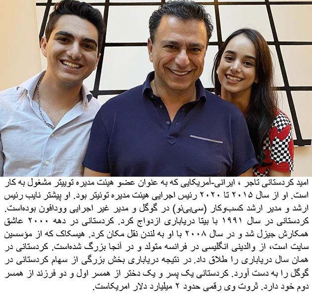 Omid R. Kordestani ( born 1963) is a businessman who is a member of the board at Twitter and was previously the Executive Chairman at Twitter from October 2015 to June 2020.