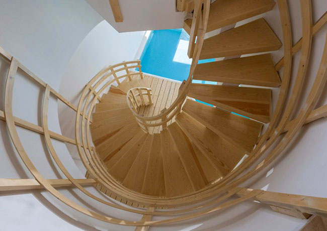 An inclined cylindrical shaft is located in the intersection point of boxes which covers the stairs and has shaped a void that due to its position supplies an oblique view among all three levels and improves family interactions.For having endless view, the sides of the boxes facing the plain have floor-to-ceiling windows with numerous panoramic views. Here windows acting a role more than just an opening or constructional element, They are like a transparent curtain between in and out that overflow interiors with natural vision.