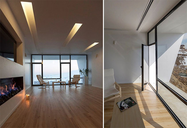 An inclined cylindrical shaft is located in the intersection point of boxes which covers the stairs and has shaped a void that due to its position supplies an oblique view among all three levels and improves family interactions.For having endless view, the sides of the boxes facing the plain have floor-to-ceiling windows with numerous panoramic views. Here windows acting a role more than just an opening or constructional element, They are like a transparent curtain between in and out that overflow interiors with natural vision.