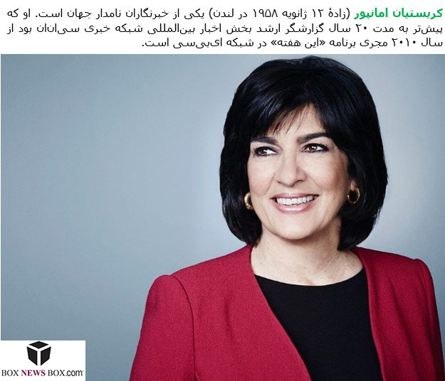 Christiane Amanpour, CBE (born 12 January 1958) is a British-Iranian journalist and television host. Amanpour is the Chief International Correspondent for CNN and host of CNN International’s nightly interview program Amanpour. Amanpour is also a Global Affairs Anchor of ABC News. As of 2014, she has been recognized as one of the journalists most world leaders follow on Twitter, according to a report by the PR firm Burson-Marsteller.