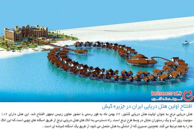 The Toranj Marine Hotel luxury hotel is in the Kish Island. The facility is divided in to two parts a marina villa’s located on a water pier. As well as a traditional tower in the landscaped grounds. The water villas are connected together with wooden walkways and are designed in a way to look like a Paisley design. Here are links to their website and Instagram pages.