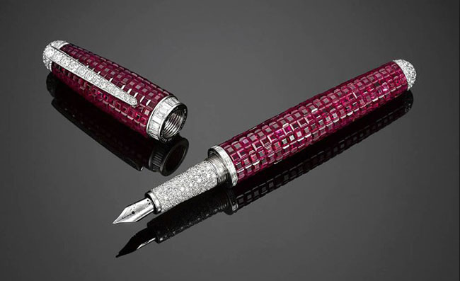 Most of us either get pens on sale at the local drug store or “borrow” them from work or other sources. If you want something a bit more extravagant, you might want to consider this ruby and diamond pen worth $595 thousand. This hand crafted writing instrument contains 150 carats of invisible set Burma rubies as well as 15 carats of diamonds.