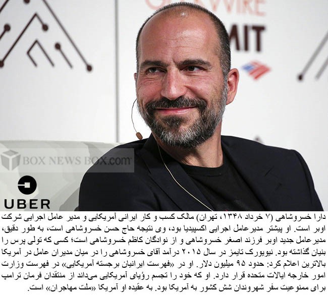 Dara Khosrowshahi (born May 28, 1969) is a businessman and the chief executive officer of Uber. Khosrowshahi was previously CEO of Expedia Group, a company that owns several travel fare aggregators. He is also a member of the board of directors of BET.com, Hotels.com, and The New York Times Company. Khosrowshahi is on the list of “Prominent Americans” published by the Embassy of the United States.