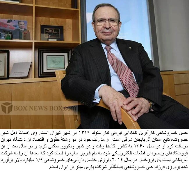 His uncle, Hassan Khosrowshahi, also fled due to the Revolution and is now a billionaire. Hassan Khosrowshahi CM OBC, is a business magnate, investor, and philanthropist. He founded Future Shop, a Canadian consumer electronics chain store that was acquired by Best Buy in 2001 for C$580 million. He currently invests via his family office, Persis Holdings Ltd. Khosrowshahi had an estimated net worth of $1.16 billion in 2016.