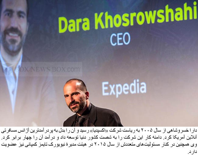 Dara Khosrowshahi (born May 28, 1969) is a businessman and the chief executive officer of Uber. Khosrowshahi was previously CEO of Expedia Group, a company that owns several travel fare aggregators. His father was not allowed to leave for 6 years and therefore Khosrowshahi spent his teenage years without seeing his father. In 1987, he graduated from the Hackley School, a private university-preparatory school in Tarrytown. In 1991, he graduated with a B.A. in electrical engineering from Brown University, where he was a member of the social fraternity Sigma Chi.