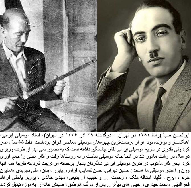 [custom_adv] Abol Hasan Sabā (April 15, 1902 – December 19, 1957) was a renowned composer, violinist, and setar player. [custom_adv] He was born in Tehran to Abul Qasim Khan Kamal ol-Saltaneh, son of Mohammad Jafar Khan Sadr ol-Hekma, son of Mahmud Khan Kashi Malak ol-Shoara Sadr ol-Shoara Saba ol-Shoara, son of Mohammad Hossain Khan Malak ol-Shoara. [custom_adv] He studied several of and non musical instruments and became an Ostad in Radif, but selected violin and setar as his specific instruments. He was a student of Mirza Abdollah as well as Darvish Khan. [custom_adv] Saba is considered one of most influential figures in traditional and instrumental Persian music. His first recording for radio was in 1927 when he played violin accompanying Iran's famous singer Ruhangis. [custom_adv] The graveside of Saba is prohibited from visitor access. His father's tomb in the same cemetery, seen here, is open to the public. The cemetery is located in Darband, Shemiran. [custom_adv] Amongst his many students who went on to become great masters of Persian traditional music were Faramarz Payvar, Manoochehr Sadeghi, Habibollah Badiei, Rahmatollah Badiyi, Abbas Emadi, Ali Tajvidi, Mahmoud Tajbakhsh, Sassan Sepanta, Saeid Gharachorloo, Parviz Yahaghi, Dariush Safvat, Gholam-Hossein Banan and Hossein Tehrani. [custom_adv] He died in 1957 and was buried in Tehran's Zahir o-dowleh Cemetery of artists and musicians. [custom_adv] Saba is above all well known for his Violin and Setar despite he mastered many other instruments such as the Ney, the Tar, the Kamancheh and the Tombak. [custom_adv] Saba was a perfect instructor, both in theory and performance. His studens became among the greatest masteros of Iranian classical music. Students such as Tehrani (Tombak), Tajvidi (violin), Payvar (santur), Kassae (Ney), Dehlavi (composer). He passed away in 1957 and was buried in Zahiroddole cemetry of Tehran. [custom_adv] Before referring to the Violin, Saba studied Kamancheh under Hossein khan Esmaeil -zadeh. His first violin teacher was Hossein khan Hang Marin and in 1923 when Vaziri Higher School of Music was established he attended his violin classes. As it is quoted from Khaleghi, Vaziri must be known as the last violin instructor. Saba and Khaleghi were both the first students of Vaziri's music classes.