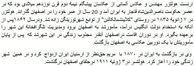 Ernest Hoeltzer (1835-1911) is a German telegraph operator and photographer who was born in 1835. He was as a photographer for Naser al-Din Shah Qajar about twenty years. In 1862 he was hired by the British government and he was appointed to the management of telegraph so he went and took the photos in the cities of our old country. Most photos of him were in our capital, but also in other cities. He died on July 3, 1911 in our homeland.