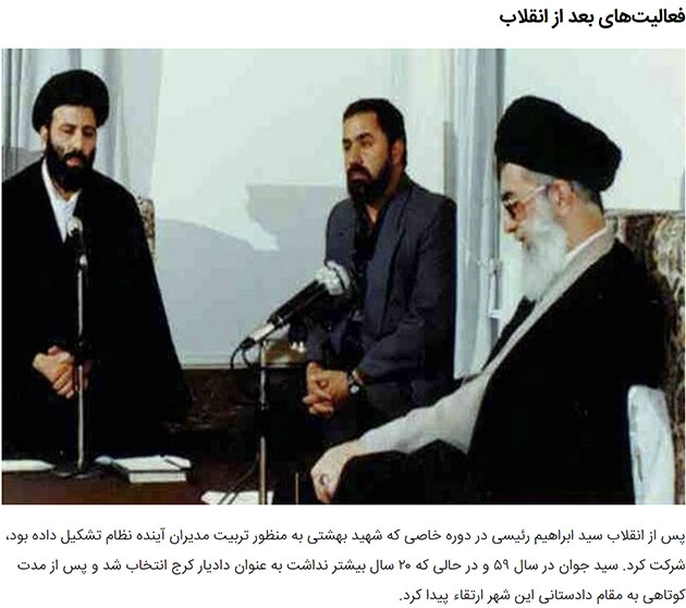 He has served in several positions in Iran’s judicial system, such as Attorney General (2014 to 2016), and Deputy Chief Justice (2004 to 2014). He was also Prosecutor and Deputy Prosecutor of Tehran in the 1980s and 1990s. He was Custodian and Chairman of Astan Quds Razavi, a bonyad, from 2016 until 2019.