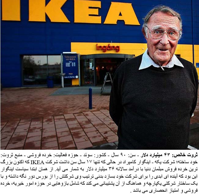 The Swedish business magnate, founder of the famous IKEA, is ranked the tenth richest person in the world at $43 billion. The Swedish retail company is the largest furniture selling company (as of 2008). Kamprad currently lives in Sweden.