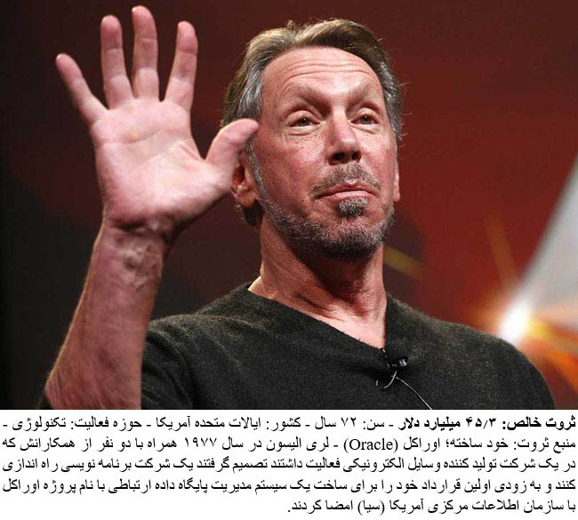 American businessman Larry Ellison is co-founder of Oracle Corporation and was CEO until September 2014. Valued at $45.3 billion, he is currently the ninth richest person in the world. Currently, he is the executive chairman and chief technology officer of Oracle. Ellison has donated up to 1% of his wealth to charity and has signed The Giving Pledge.