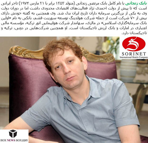 Babak Morteza Zanjani also known as Babak Zanjani is an Iranian businessman. He was the Managing Director of UAE-based Sorinet Group, one of Iran’s largest business conglomerates. He also owned the Qeshm Airlines and Rah Ahan Sorinet F.C. in Iran.Zanjani was named in the European Union’s restrictive measures against Iran of December 2012.Sorinet Group is an Iranian business conglomerate. The company is one of Iran’s largest business conglomerates. Sorinet businesses include cosmetics, finance and banking, hospitality, commercial aviation, infrastructure, building material, information technology and international real estate development. Its operations are in Iran, United Arab Emirates, Turkey, Tajikistan, Malaysia and China as well as other emerging markets in the region.