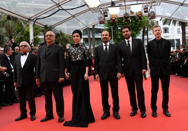 French producer and distributor Alexandre Mallet-Guy, actor Shahab Hosseini, director Asghar Farhadi,  actress Taraneh Alidoosti, actor Babak Karimi and actor Farid Sajjadihosseini pose as they arrive on May 21, 2016 for the screening of the film “The Salesman (Forushande)” at the 69th Cannes Film Festival in Cannes, southern France.