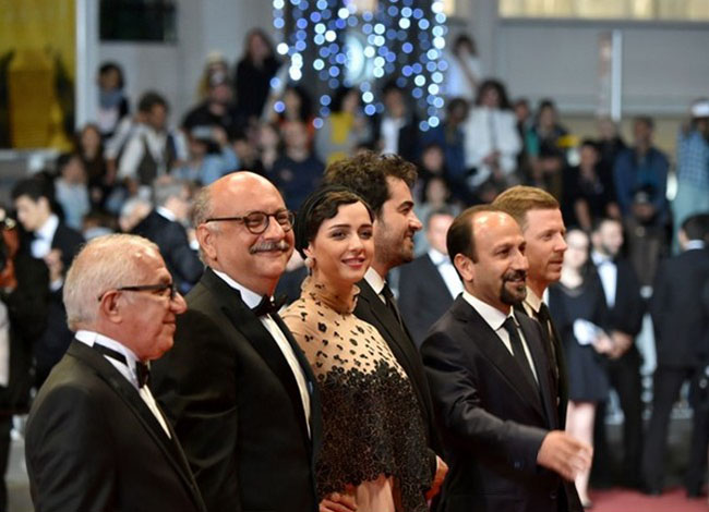 French producer and distributor Alexandre Mallet-Guy, actor Shahab Hosseini, director Asghar Farhadi,  actress Taraneh Alidoosti, actor Babak Karimi and actor Farid Sajjadihosseini pose as they arrive on May 21, 2016 for the screening of the film “The Salesman (Forushande)” at the 69th Cannes Film Festival in Cannes, southern France.