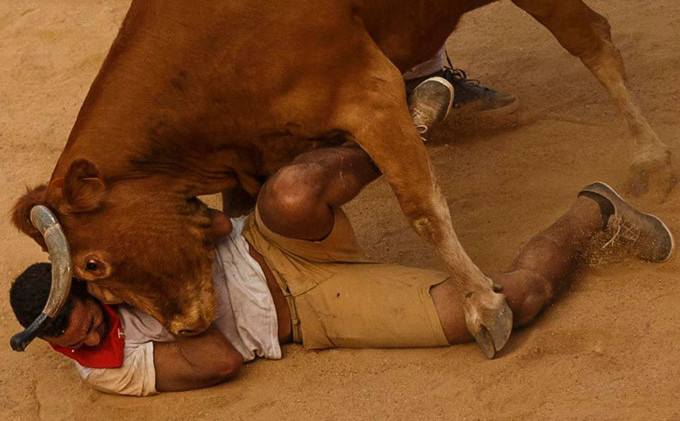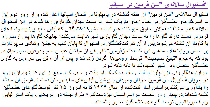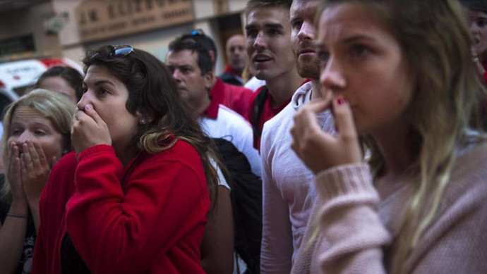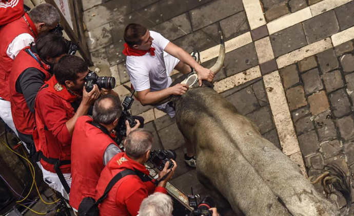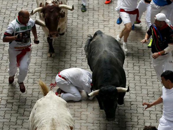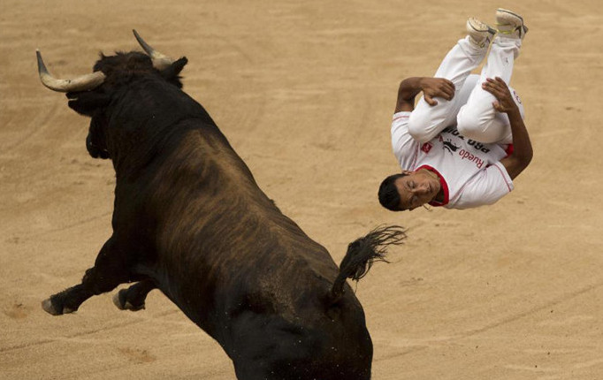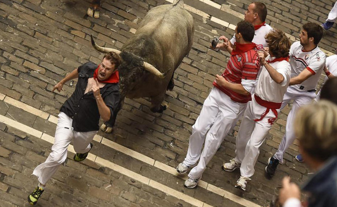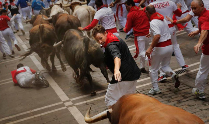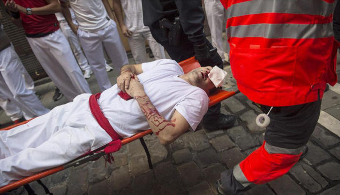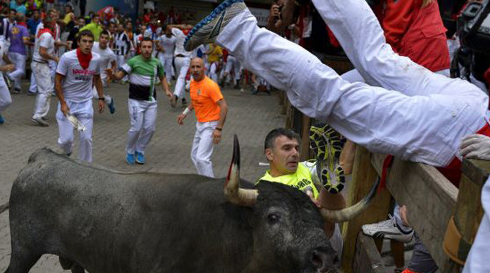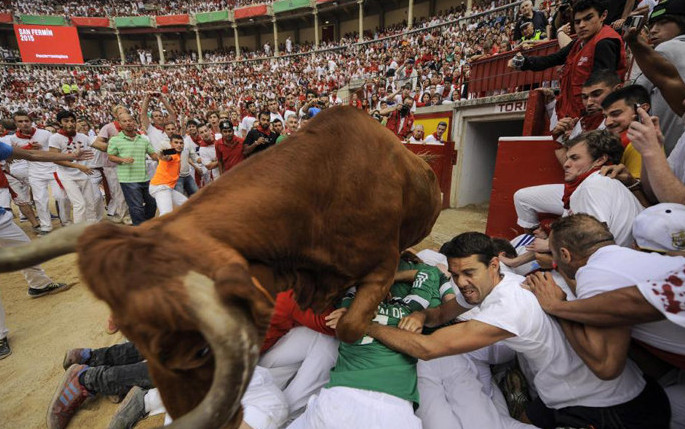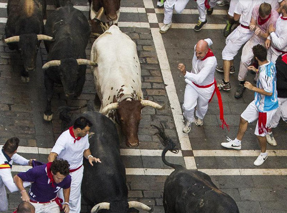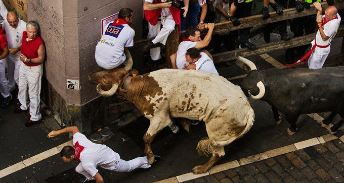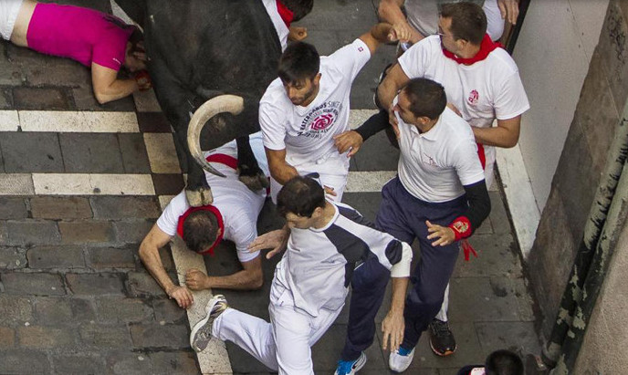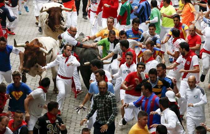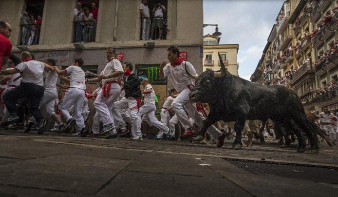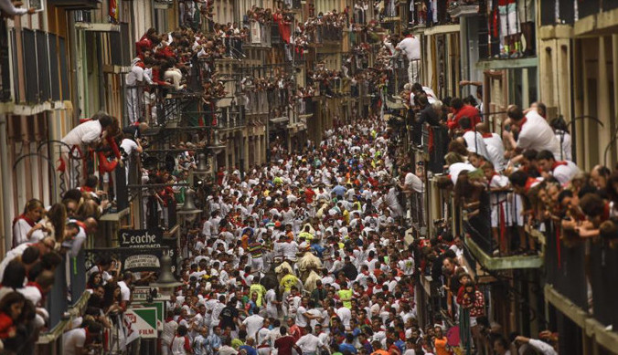 The festival of San Fermín in the city of Pamplona (Navarre, Spain) is a deeply rooted celebration held annually from 12:00, 6 July, when the opening of the party is marked by setting off the pyrotechnic chupinazo, to midnight 14 July, with the singing of the Pobre de Mí. While its most famous event is the encierro, or the running of the bulls, which happens at 8:00 am from 7 July to 14 July, the week-long celebration involves many other traditional and folkloric events. It is known locally as Sanfermines and is held in honor of Saint Fermin, the co-patron of Navarre. Its events were central to the plot of The Sun Also Rises, by Ernest Hemingway, which brought it to the general attention of English-speaking people. It has become probably the most internationally renowned fiesta in Spain. Over 1,000,000 people come to participate in this festival.