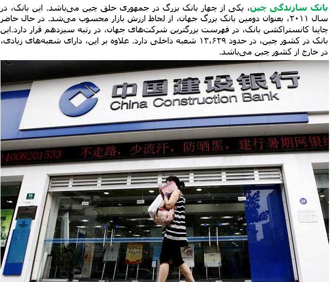 One of the big four banks of China, the bank is one of the top largest company in the world. The bank besides having 13629 domestic branches maintains overseas branches in New York, Sydney, Melbourne, Seoul, Tokyo, Frankfurt, Luxembourg and is headquartered in Xicheng district, Beijing.The bank offers personal banking and corporate banking services. Under personal banking it offers e-banking, deposit services in foreign currency as well as in Renminbi, long credit card, personal loans, gold business, foreign exchange transaction management like settlement, options, personal wealth management. Total Assets: $2698.9 B, Profits: $37 B,Market Value: $212.9 B, Return On Assets Ratio: 1.37%.