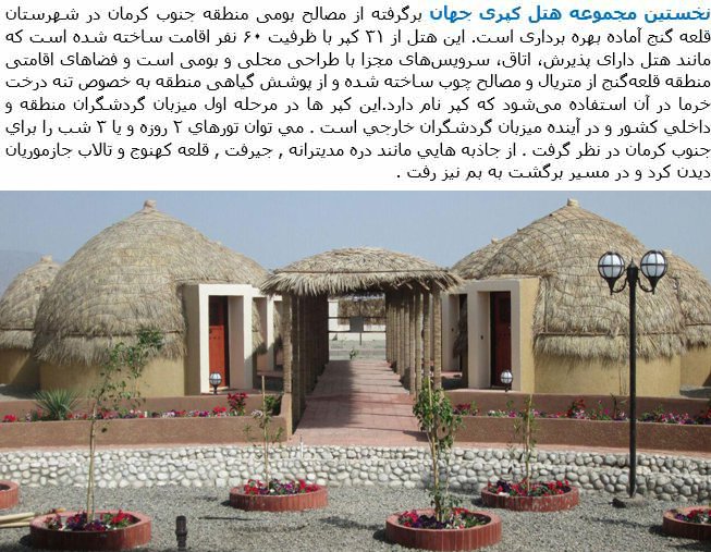The first hut hotel will be established in southern Kerman Province will open this March 2016, said the deputy head of the provincial cultural heritage, handicraft and tourism department.the hotel, which take in 31 huts with a capacity of 60 guests, has been designed according to regional culture and architectural styles.