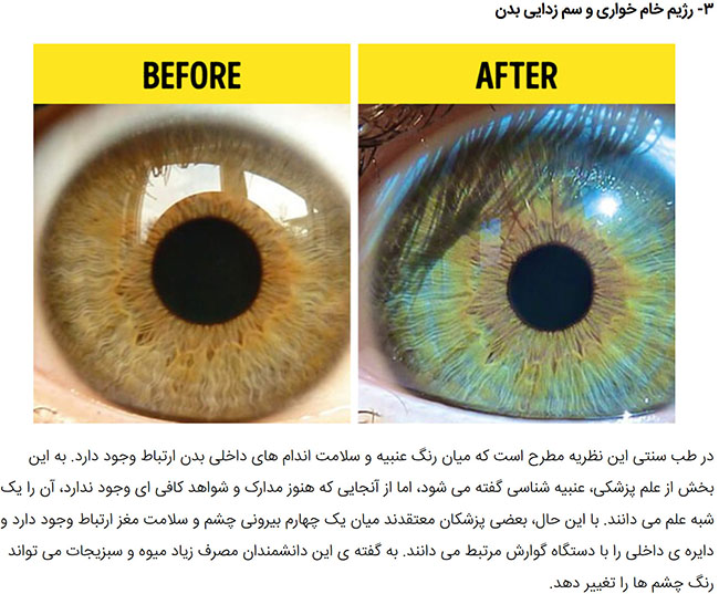 There is a theory in alternative medicine that the color of the irises and the health of internal organs are connected. This direction in medicine is called iridology but since it doesn’t have a sufficient evidence base, it is considered pseudoscientific. But Dr. Robert Morse, a health expert who’s had a quarter of a million patients, believes that the outer quadrant of the eye is connected with the health of the brain while the inner circle is connected with the digestive system. He says that plenty of fruits and vegetable in your diet can change the color of your eyes and he even created a series of videos dedicated to his research.