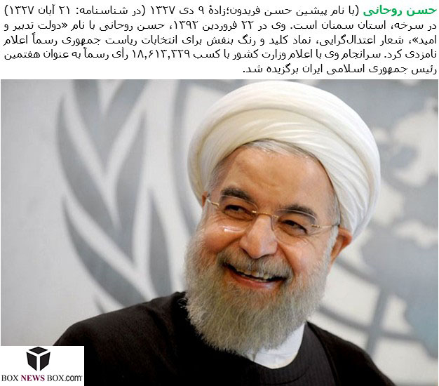 Hassan Rouhani ( born Hassan Fereydoun on 12 November 1948) is the seventh President of Iran, in office since 2013. He is also a former lawmaker, academic and former diplomat. He has been a member of Iran’s Assembly of Experts since 1999, member of the Expediency Council since 1991,[13] member of the Supreme National Security Council since 1989.On 7 May 2013, Rouhani registered for the presidential election that was held on 14 June 2013. He said that, if elected, he would prepare a “civil rights charter”, restore the economy and improve rocky relations with Western nations. Rouhani is persistently described as “moderate” but has also described Israel as an “enemy” and said that “we need to find ways to express death to America with action.”