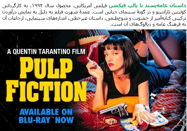 Pulp Fiction is a 1994 American black comedy crime film written and directed by Quentin Tarantino, from a story by Tarantino and Roger Avary.[4] The film is known for its eclectic dialogue, ironic mix of humor and violence, nonlinear storyline, and a host of cinematic allusions and pop culture references. The film was nominated for seven Oscars, including Best Picture; Tarantino and Avary won for Best Original Screenplay. It was also awarded the Palme d’Or at the 1994 Cannes Film Festival. A major critical and commercial success, it revitalized the career of its leading man, John Travolta, who received an Academy Award nomination, as did co-stars Samuel L. Jackson and Uma Thurman.