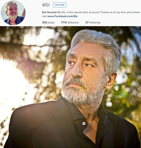 Ebrahim Hamedi ( born June 19, 1949), known better by his stage name Ebi , is an Iranian singer. He is widely known for his vocal range.Ebi was born in Tehran, the eldest of six siblings. He received early musical schooling, as he was discovered by the Ministry of Art and Culture at a very early age. Declining an offer to further pursue classical schooling as an opera soloist in Italy, Ebi instead turned to popular music as a member in the group “Sun Boys”. A major breakthrough was Ebi’s performance of the song “Shab” (Night) at Fereydoun Farrokhzad’s TV-show “Mikhak-e Noghreyi”. During a series of planned concerts in the United States, Ebi, due to the Iranian Revolution|revolution of 1979, decided not to return to Iran.