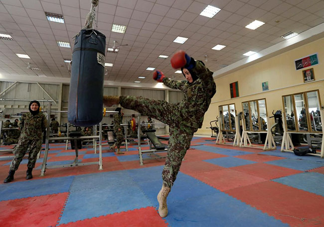 Fatima Rezai, 21, a female officer from the Afghan National Army (ANA) practices with a punching bag during an exercise session at at the Kabul Military Training Centre.