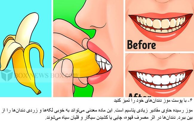 Ripe banana peels are very rich in potassium that can help reduce yellow stains that appear as a result of the consumption of certain beverages such as coffee and tea and certain foods such as blueberries and raspberries.