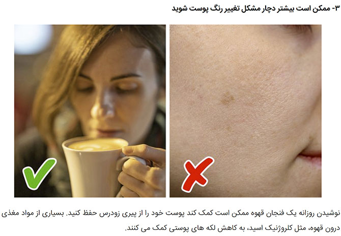 A cup of coffee a day may help protect your skin from photoaging. Many trace elements in coffee, like chlorogenic acids, help to decrease the appearance of pigmented spots.