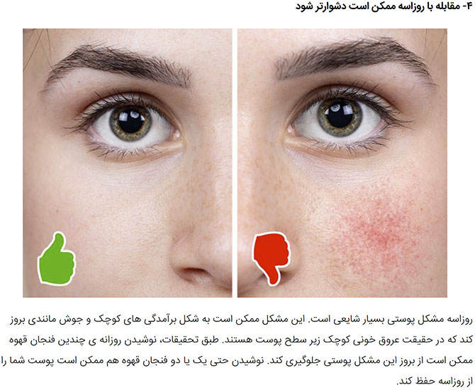 Rosacea is a very common skin condition that affects more than 14 million people in the US. It may look like small, acne-like bumps that are actually tiny blood vessels under the surface of the skin. Drinking several cups of coffee daily may prevent rosacea, according to research. Even drinking just a cup or 2 a day may help protect your skin from rosacea.