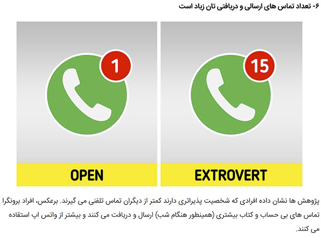 Research showed that more open people tend to make fewer phone calls than others. On the contrary, extroverted people make and receive more irregular calls (at night too), and use WhatsApp more frequently. How much time do you spend on your phone? Do you recognize any of these traits in yourself?