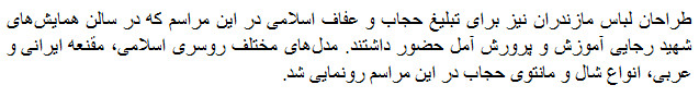 Western style clothing is favoured by many women – who adjust their modern outfits to suit Islamic dress codes. But the tide is turning in some Islamic fashion houses. Islamic fashion need not be dreary, that’s the message of this collection of Islamic fashions in Amol.One aspect of the rules remains unchanged, however, and that is the requirement to cover at least a portion of one’s hair and most of one’s body.