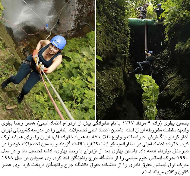 Yasmine Pahlavi (born 26 July 1968) is the wife of Reza Pahlavi, the last crown prince of the former Imperial State .Yasmine Etemad-Amini was born in Pars Hospital on July 26, 1968. She attended the private Community School until the rising tensions in the late 1970s forced her family to leave permanently. They settled in the San Francisco area of California, where she attended and matriculated at Notre Dame High School.