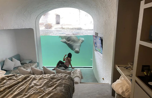 [custom_adv] The Walrus House at Pairi Daiza Resort has one wall that looks on to the side of the walrus tank. [custom_adv] Guests may not have much privacy, but they'll get the incredible experience of being up close and personal with the walruses. [custom_adv] You can fully immerse yourself in an underwater world. [custom_adv] The suite is part of The Land of the Cold in the zoo. It's been designed in keeping with the Arctic style, in icy shades of silver, blue, and white. [custom_adv] The glass is cleaned once a week to make sure it remains crystal clear. [custom_adv] There's a lounge area with a TV — but you may find the walruses more entertaining to watch. [custom_adv] As well as an open-plan living and sleeping area, the suite has a bathroom with white walls, ice motifs, and gilded brass fittings. [custom_adv] You may prefer not to sleep in the bed at all though, in favor of staying close to your new friends.